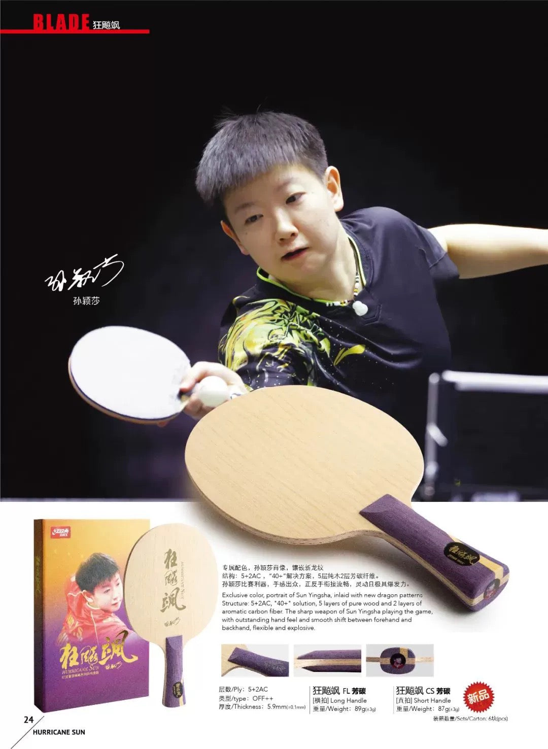 - Exklusives Farbporträt von Sun Yingsha, eingelegt mit neuer Drachenmusterstruktur: 5+2AC, "40+"-Lösung, 5 Schichten aus reinem Holz und Schichten aus aromatischer Kohlefaser. Die scharfe Waffe von Sun Yingsha spielt das Spiel mit hervorragenden Handgefühl und glatter Verschiebung zwischen Vorhand und Rückhand, flexibel und explosiv.
